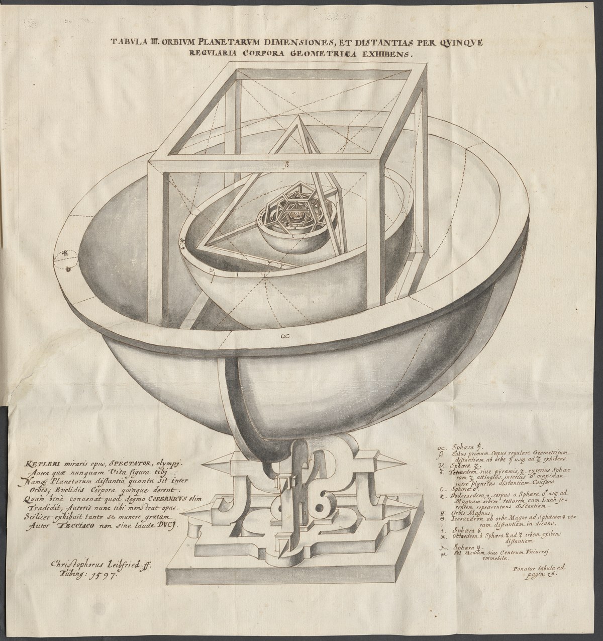 케플러는 5개의 정다면체와 6개의 행성의 천구를 조합시켜 독자적인 태양계의 모델을 생각했다. 먼저 토성의 천구 내부에 접하도록 정육면체 놓았다. 그리고 이 정육면체와 접하도록 내부에 목성의 천구를 놓았고, 목성의 천구 내부에 정사면체를 놓고 그 내부에 화성의 천구를 놓고, 그 내부에 정십이면체를 놓고 그 내부에 지구의 천구를 놓고, 그 내부에 정이십면체를 놓고 그 내부에 금성의 천구를 놓고, 그 내부에 정팔면체를 놓고 그 내부에 수성의 천구를 놓는 식으로 배치했다. 이 모델을 '우주의 신비'에서 발표했다.