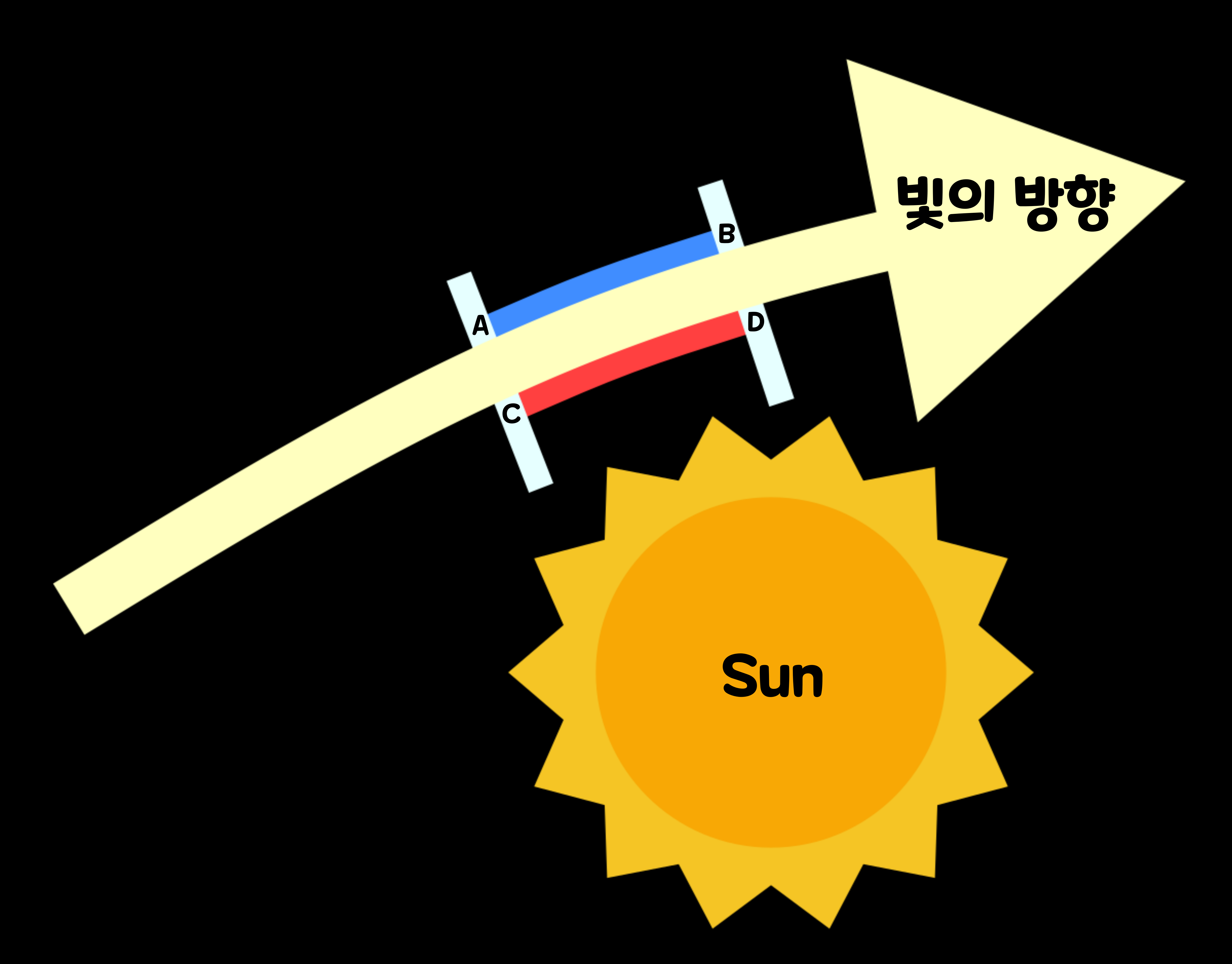 아래의 그림은 큰 질량을 가진 항성에 의해 중력에 휘어지는 빛이다. 그리고 빨간색 항성에서 먼 가장자리의 길이 A~B는 항성에 가까운 가장자리의 길이 C~D보다 길어진다. 이것은 C~D 부분이 A~B 부분보다 느리게 나아가는 것을 의미한다. 그렇다면 '광속도 불변의 원리'가 무너진 것일까? 그런 것은 아니다.