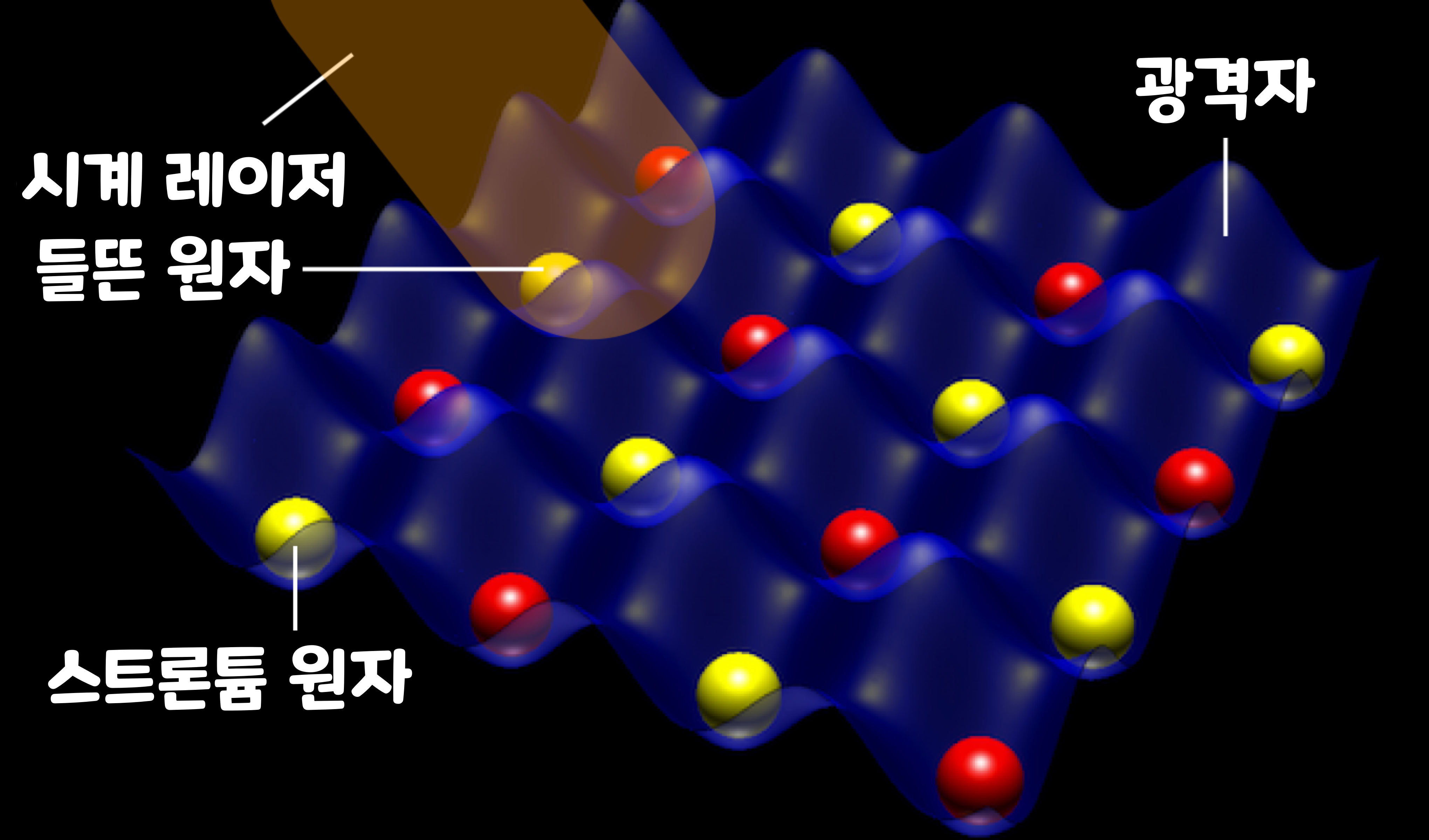 '광격자(optical lattice)'는 계란판 모양을 하고 있다. 실제로 이와 같은 모양이 보이는 것이 아니라, 격자 모양의 요철은 에너지의 고저차를 나타낸다. 수만 개의 스트로튬 원자가 에너지가 낮은, 움푹 들어간 부분에 포획된다. 전후, 좌우, 상하의 여섯 방향에서 레이저를 쏘아 원자를 고정시키는 '빛의 입자 격자'를 만들고 그 안에 스트론튬 원자를 넣는다. 이때 발생하는 높은 진동수를 측정하는데, 이 진동수와 역수의 관계에 있는 주기를 단위로 시간을 잰다.