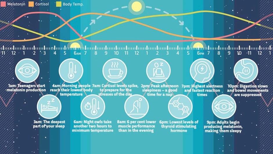 아래의 그래프는 우리 몸속에서 '약 24시간 주기로 변하는 3가지 양을 그래프로 나타낸 것이다. '코르티솔(Cortisol)', '멜라토닌(Melantonin)'이라는 2가지 호르몬의 혈중 농도와 '체온(Body Temperature)'이다. 예컨대 오후 2시쯤에 졸게 되는 것은 이런 리듬 때문이지, 흔히 알려진 것처럼 '점심 식사 뒤에 혈액이 위에 집중되기 때문'은 아니다.