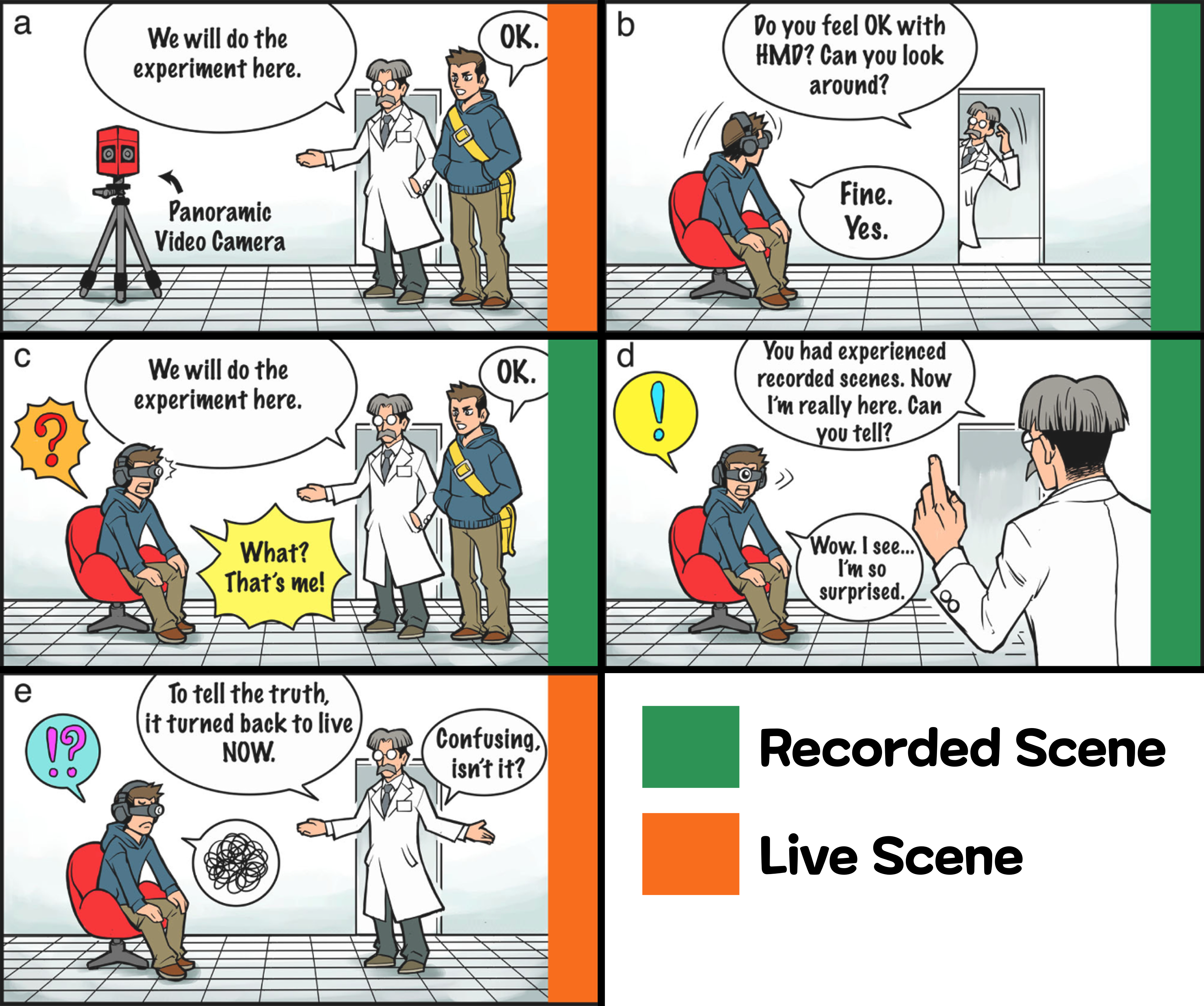 또 디스플레이의 영상을 사전에 녹화해 둔 과거의 영상으로 바꾸어 체험자에게 보게 할 수도 있다. 이 영상은 체험자의 위치에서 360° 방향을 한 번에 촬영할 수 있는 비디오카메라를 사용해서 촬영된 것이다. 그래서 체험자가 어디를 보고 있어도, 그 방향에 맞추어 바꾼 영상을 보게 할 수 없다. 즉, 체험자는 그때 보고 있는 것이 실시간 영상인지 과거의 영상인지를 구별할 수 없게 되는 것이다. 그리고 '현재'에서 '과거'로 영상을 매끄럽게 바꾸면, 체험자는 과거의 일은 '현재 이곳에서 일어나고 있는 일'로 체험하게 된다.