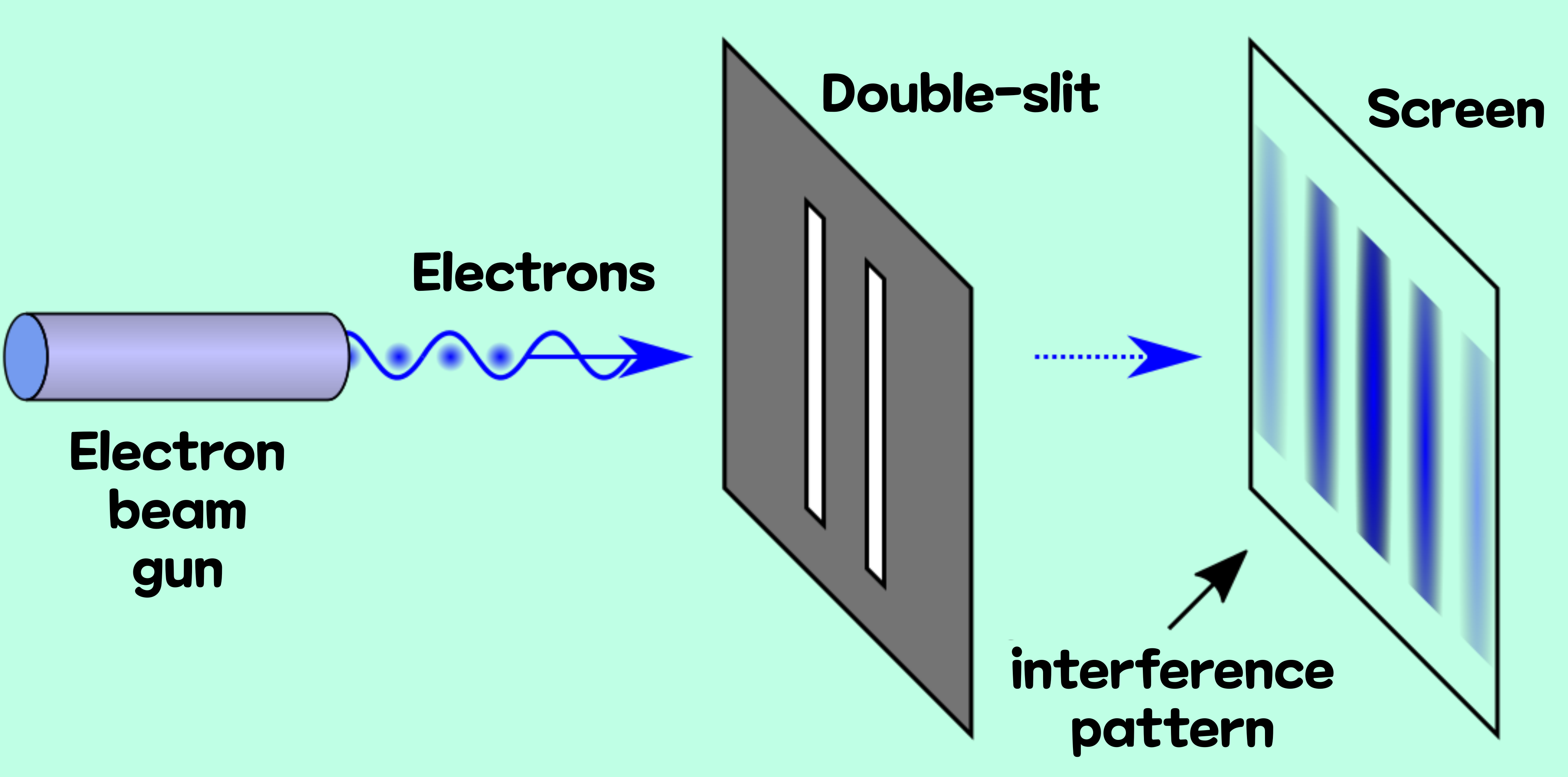 전자가 파동의 성질을 갖는다고 하면 의외라고 생각될 수도 있겠지만, 전자가 파동의 성질을 가지고 있다는 사실을 인정할 수밖에 없는 증거들이 많이 있다. 그중 가장 유명한 것이 '전자의 이중 슬릿 실험'이다. '전자의 이중 슬릿 실험'에서는 '전자총(electron beam gun)'에서 전자를 1개씩 여러 차례 발사한다. 그리고 '전자(elctron)'가 '스크린(screen)'에 도달하면, 그 궤적이 기록된다. 전자총과 스크린 사이에는 '2개의 슬릿(double-slit)'이 있는 판이 놓여 있다.