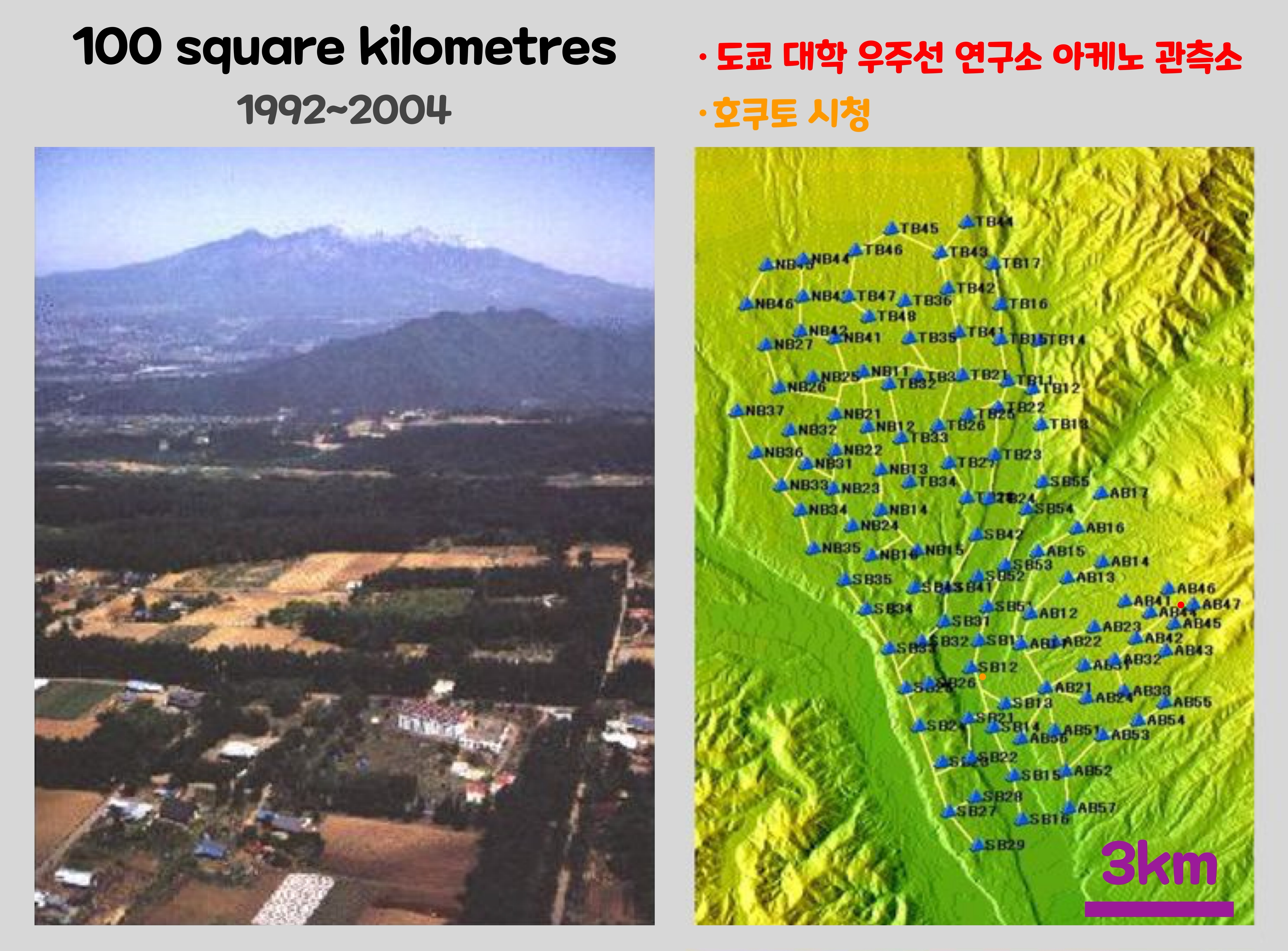 AGASA는 도쿄 대학 우주선 연구소 '아케노 관측소' 주변에 펼쳐져 있는 거대한 검출기이다. 약 100km2나 되는 공간에 11대나 되는 '신틸레이터 검출기'를 약 1km 간격으로 설치했다. '신틸레이터 검출기(Scintillator Detector)'란 우주선이 통과하면 으슴푸레한 빛을 내는 장치이다. 111대의 검출기는 모든 광섬유에 접속되어 '공기 샤워(Air shower)'의 검출을 알리는 신호가 관측소에 모인다. 각 신틸레이터 검출기의 신호 시간의 차를 해석하면, 1차 우주선이 온 방향을 알아낼 수 있다.