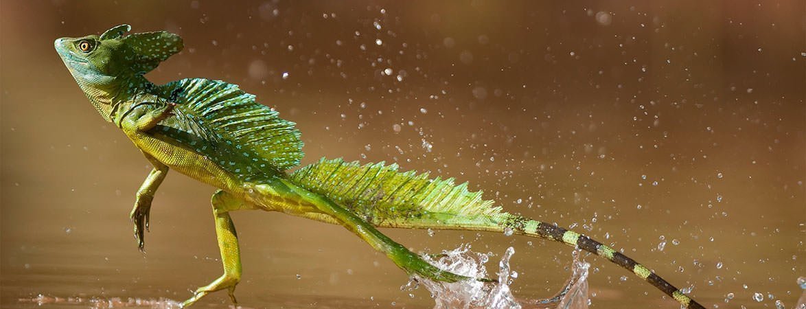 '등지느러미 도마뱀(Basiliscus sp.)'은 중앙아메리카의 정글에 서식한다. 이들은 몸무게가 2~500g 정도 되는데, 놀랍게도 눈으로 식별하기 어려울 정도로 빠른 속도로 수면 위를 달려나갈 수 있다. 정말 신기한 동물이다. 수면을 달리는 도마뱀은 그 밖에도 여러 종이 있는데, 갓 태어났을 무렵부터 달릴 수 있는 것은 '등지느러미 도마뱀' 뿐이라고 한다.