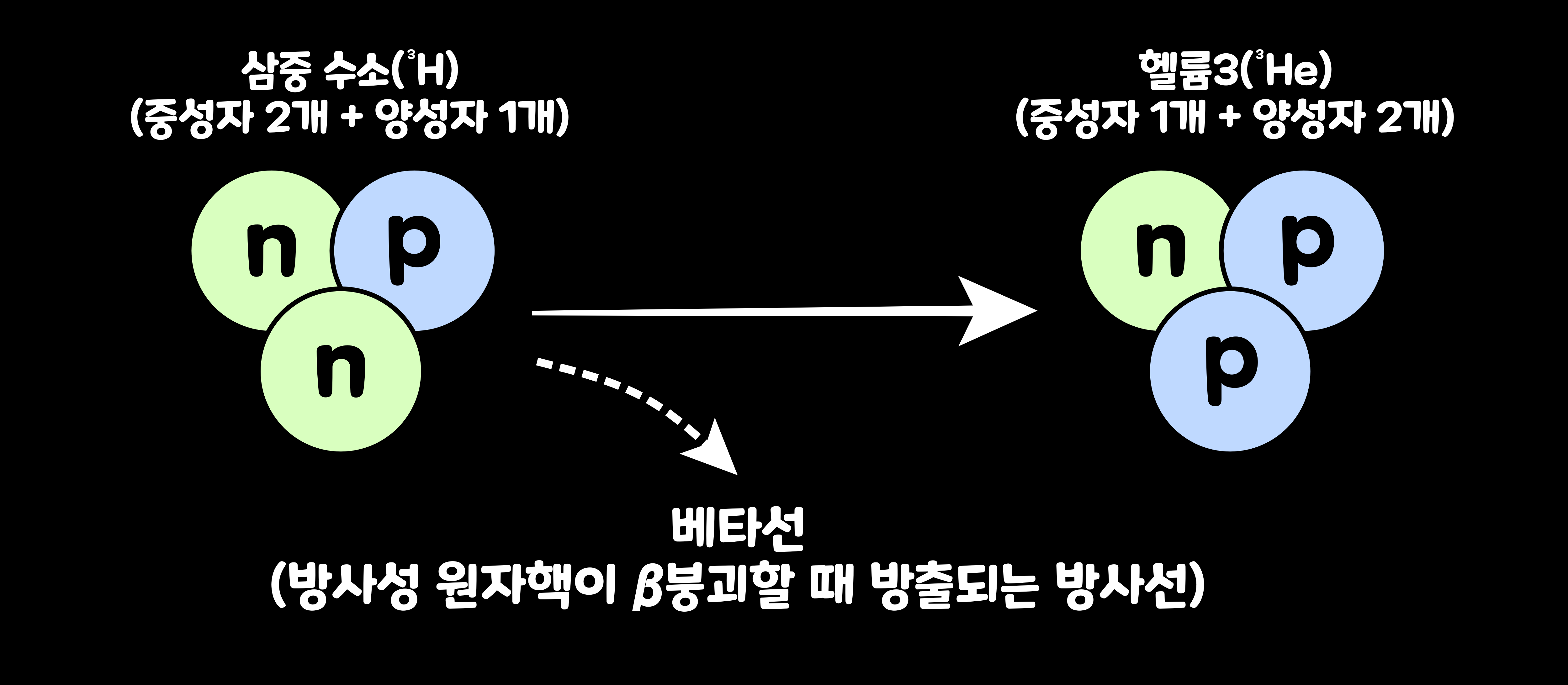 - 삼중 수소(3H): '양성자 1개'와 '중성자 2개'로 이루어진 수소 원자이다. '수소3'이라고도 한다. 삼중 수소는 '수소 3' 또는 '트리튬(tritium)'이라고한다. 베타선이라는 방사성 동위 원소로, 베타선이라는 방사선을 내고 헬륨 3로 바뀐다. 이에 따라 중성자 하나가 양성자로 변하고, 원자 번호가 늘어나 수소에서 헬륨이 된다.