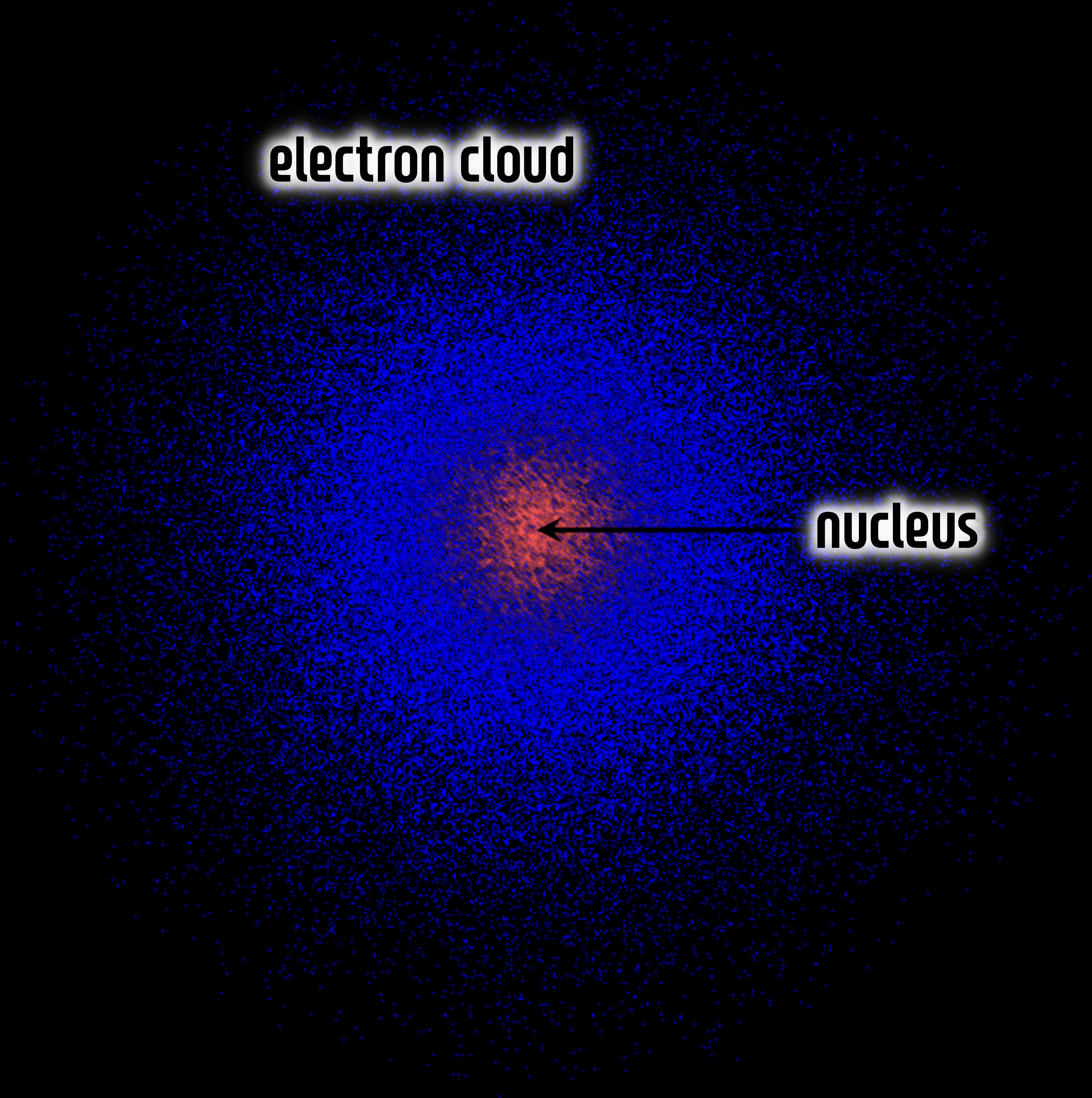 원자는 서로 다른 모양을 한 구름 같은 것이 겹쳐 커다란 공을 이루고 있다. 구름처럼 보이는 것의 정체는 '전자(electron)'이고, 중앙에는 '원자핵(Atomic Nucleus)'이 있다. 원자의 질량은 거의 모두가 이 원자핵에 집중되어 있다. 그러나 원자핵의 반지름은 원자 전체의 1만 분의 1 정도이며, 실제로는 점으로도 그릴 수 없을 정도로 작다. '원자(Atom)'은 원자핵과 그것으로 둘러싼 '전자구름(electron cloud)'으로 이루어진다.