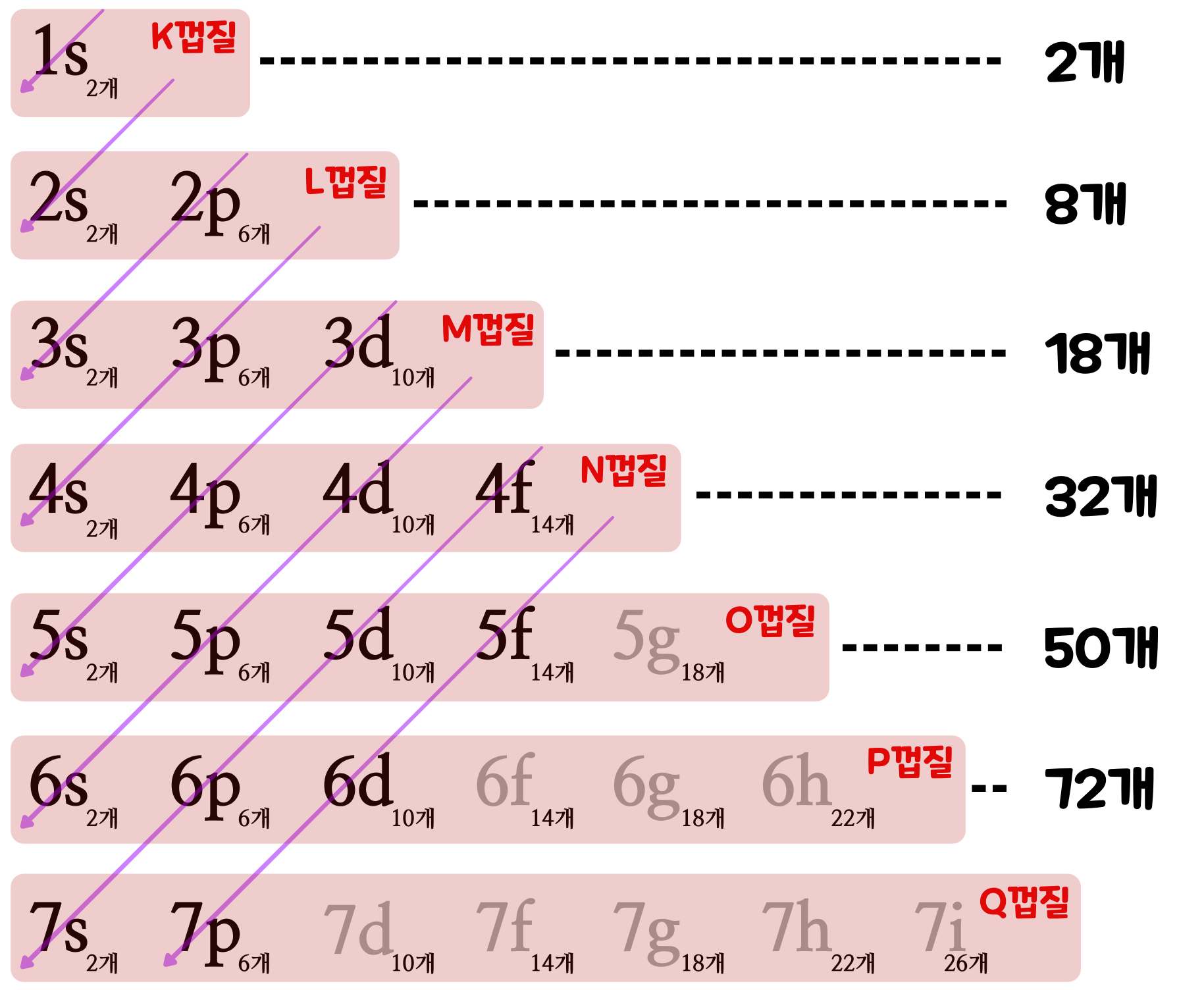 원자핵에서 먼 전자껍질일수록 많은 전자 부껍질을 갖기 때문에 전자껍질에 존재할 수 있는 전자의 총수도 많아진다. 그리고 전자 부껍질은 각각 원자핵까지의 '가까운 정도'가 서로 다르다. '아래의 표'에서 보라색 화살표는 '원자핵에서 가까운 전자 부껍질의 순서'를 나타낸 것이다. 원자핵으로부터 가장 가까운 '전자 부껍질'을 순서대로 배열하면, 아래에 있는 그림처럼 1s, 2s, 2p, 3s, 3p, 4s, 3d, 4p, 5s, 4d, 5p, 6s, 4f, 5d, 6p 7s, 5f, 6d, 7p... 와 같은 순서이다. 예컨대, M 껍질에 있는 4s 전자 부껍질은, M 껍질에 있는 3d 전자 부껍질보다 원자핵에 가깝다.