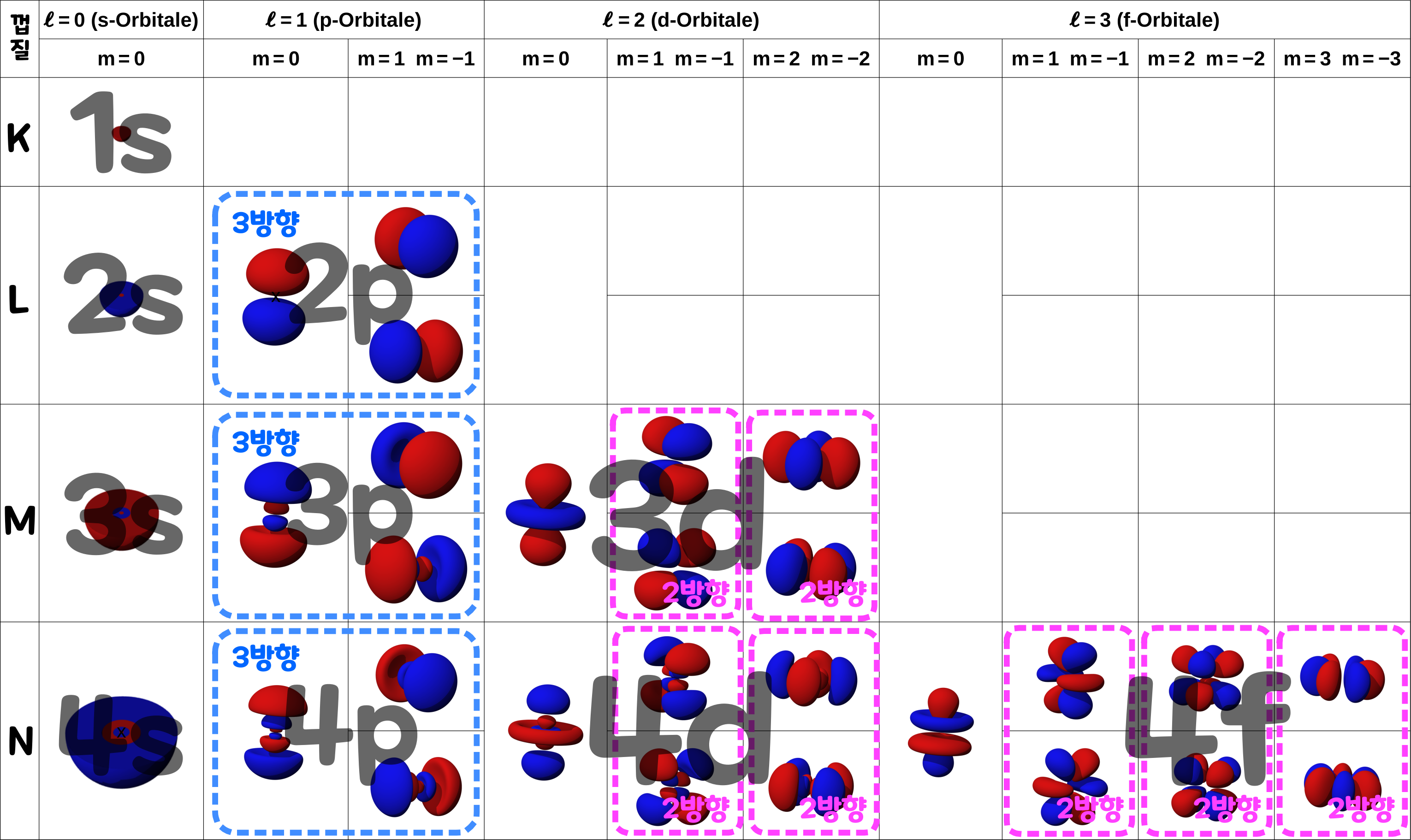 1924년 스위스의 이론 물리학자 '볼프강 파울리(Wolfgang Pauli, 1900~1958)'는 어느 하나의 '존재할 수 있는 영역'을 가질 수 있는 전자는 최대 2개라고 주장했다. 즉, 같은 모양의 '전자구름'에 전자가 최대 2개까지 존재할 수 있다는 것이다. 이를 이해하기 위해 아래의 표를 보자. 아래의 표는 K껍질~N껍질의 전자구름의 일람표이다. '전자 부껍질'의 부품에 해당하는 '전자구름'의 수는 예컨대, s는 1개 p는 3개, d는 5개, f는 7개라는 식으로 증가한다.