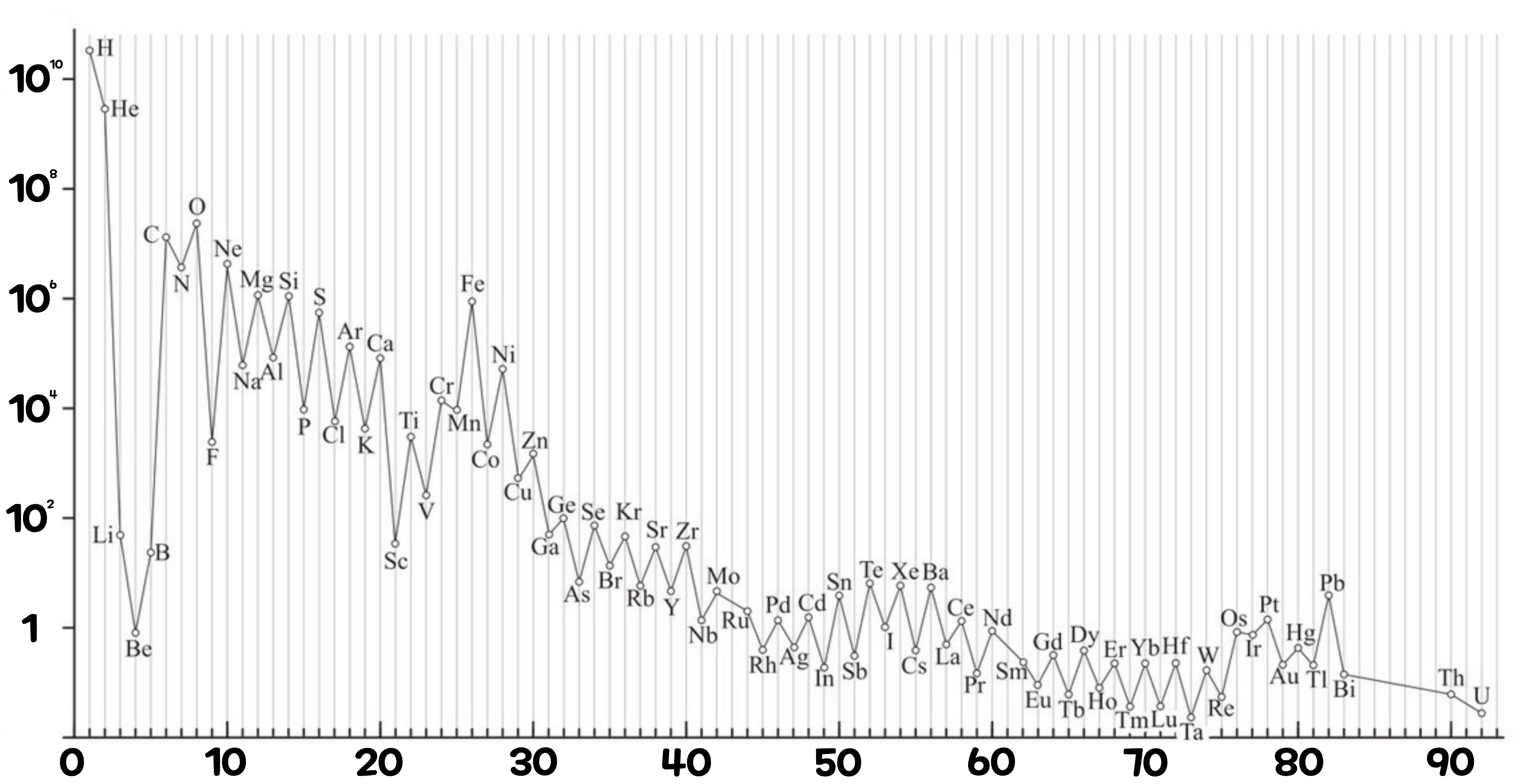 우주에는 아래의 그래프에 그려진 것과 같은 비율로 원소가 존재한다. 지구에 존재하는 원소를 비롯해, 지구에 떨어진 운석에 포함된 원소, 태양이나 그 밖의 항성에 존재하는 원소의 종류와 존재도를 정리한 것이다. 태양이나 항성에서의 원소 존재도는, 주로 독일의 물리학자 '구스타프 키르히호프(Gustav Kirchhoff, 1824~1887)'나 독일의 화학자 '로베르트 분젠(Robert Wilhelm von Bunsen, 1811~1899)'이 확립한 '분광학(Spectroscopy)'에 의해 19세기 이후 밝혀져 왔다. 그리고 최근에는 지상 망원경에 의해 다양한 천체에서 원소의 존재도가 관측된다.
