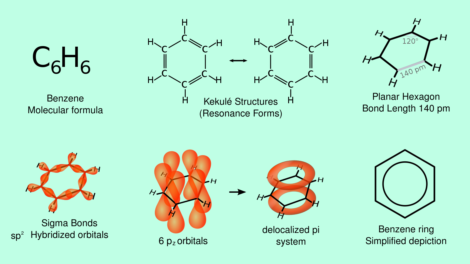 케쿨레는 '벤젠(Benzene)'은 6개의 탄소가 단일 결합과 이중 결합으로 연결되어, 고리 모양으로 된 분자라고 생각했다. 그리고 벤젠의 탄소는 각각 1개의 수소와 결합하고 있으며, 이 수소는 탄소의 사실과 마찬가지로 다른 원자 등과 바꿀 수 있다고 생각했다. 벤젠처럼 '단일 결합'과 이중 결합'으로 고리를 만드는 물질의 일부는, 고리 모양을 그대로 보존한 채 수소를 다양한 '장식'으로 바꿀 수 있다. 이들 물질은 향기를 갖는 것이 많기 때문에 '방향족'이라고 불리게 되었다. 결합하고 있는 전자의 상태에는 몇몇 종류가 있는데, 이중 결합이나 삼중 결합의, 2개 이후의 경우를 '파이 결합(π 결합)'이라고 한다. '방향족'인지 아닌지는 정확하게는 고리 모양의 분자가 '파이 결합(π 결합)'을 '2n+2(n=1,2,3, ...)개' 가지고 있느냐에 따라 결정된다.