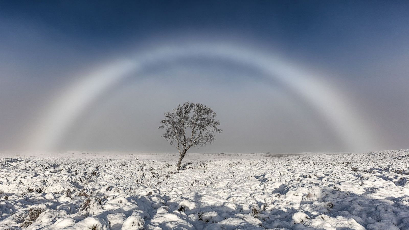 아래의 사진은 '사진 작가 '멜빈 니콜슨(Melvin Nicholson)'씨가 2016년 11월 20일에 '스코틀랜드(Scotland)' 서부의 황무지 위'에서 포착한 흰색 '안개 무지개(fog bow)'이다. '멜빈 니콜슨(Melvin Nicholson)'씨는 ABC News와의 인터뷰에서 '글렌코(Glencoe)' 마을 근처의 Rannoch Moor를 탐험하다가 드문 기상 현상을 포착했다고 밝혔다. '멜빈 니콜슨'씨는 아침에 친구가 아름다운 나무를 알고 있다고 해서 외출 중이었다고 한다. 친구가 말한 나무는 바로 아래의 사진 중앙에 있는 나무이다. 그들이 나무에 도착했을 때, 그는 그 지역이 믿을 수 없을 정도로 안개가 자욱하다는 사실을 알아차렸다고 한다. '그때 태양이 우리 뒤에서 떠오르기 시작하여 안개를 태우고 그 지점에서 안개꽃이 나타났다.'고도 회상했다.