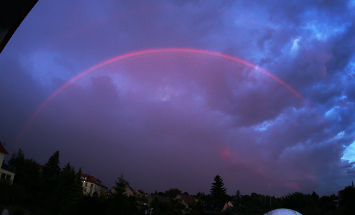 아래의 사진은 무지개의 고도가 높은 것으로 보아, 태양의 고도가 낮은 새벽이거나 저녁때임을 알 수 있다. 태양 고도가 낮을 때의 태양빛은 대기를 길게 통과하기 때문에 푸른색 빛이 사라진다. 이것이 '아침노을(Morning Glow)'과 '저녁노을(The evening glow)'의 원인이다. 그래서 일반적으로는 희미하게 희고 밝은 무지개의 안쪽이, 이 무지개에서는 붉게 물들어 있다.