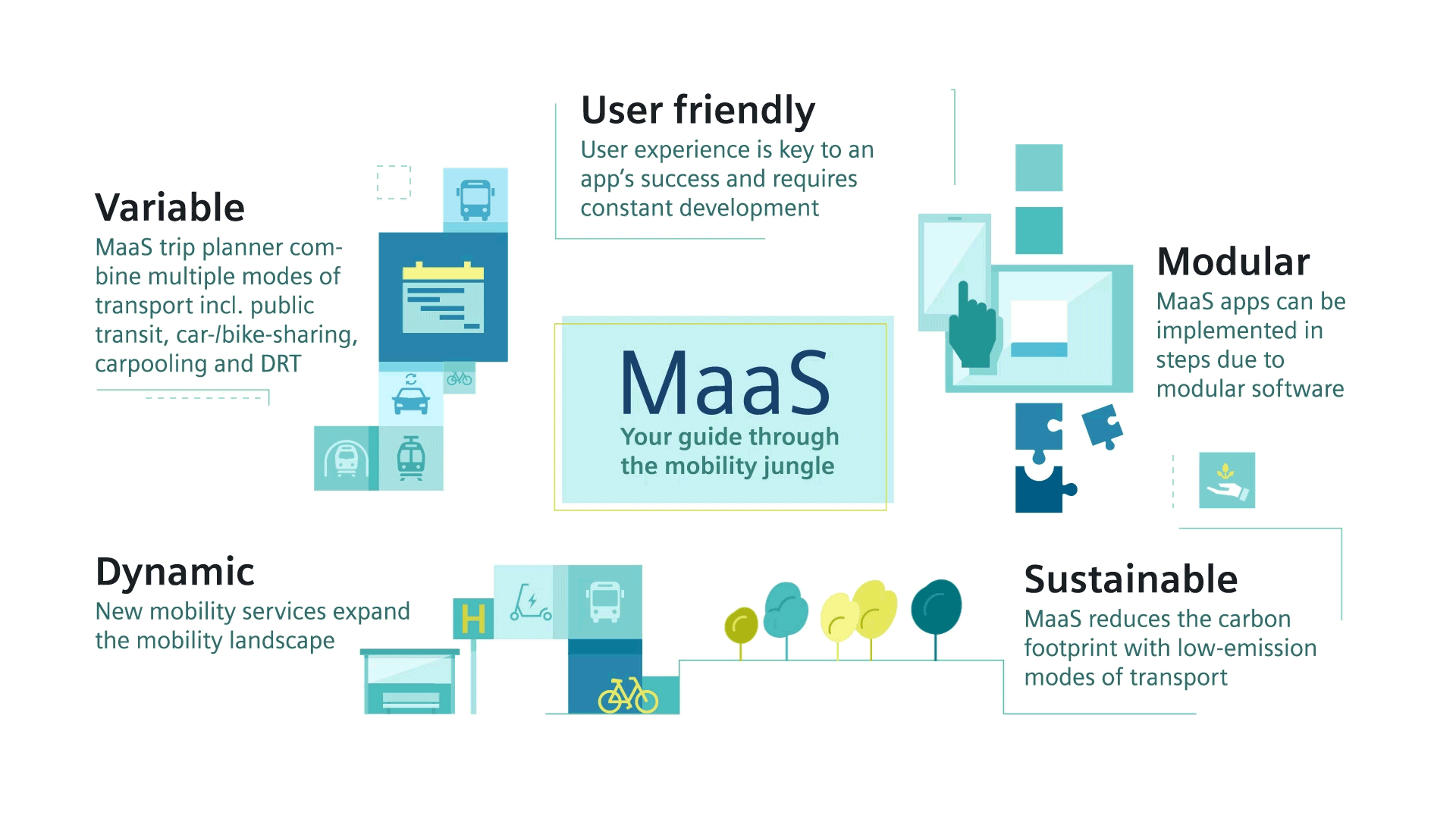 'Maas'는 택시, 버스, 지하철 등 대중교통과, 차량 대여 및 공유, 자전거 혹은 전동스쿠터 같은 개인 이동수단 대여, 주차시설 활용, 숙박을 아우르는 '통합 서비스'이다. 이미 프랑스의 파리를 비롯해 독일의 하보너나 구텐베르크, 스페인의 바르셀로나, 핀란드의 헬싱키, 미국의 라스베이거스와 로스앤젤레스 등 많은 도시에서 실험되고 있다. 이 중 핀란드의 헬싱키는 국가 차원에서 직접 MaaS를 구축하고, 2017년 중반부터 'Whim'이라는 Maas 어플을 통해 상용화 서비스를 제공하고 있다. 국내에서는 '카카오 모빌리티(Kakao Mobility)', '티맵 모빌리티(Tmap Mobility), '쏘카(Socar)' 등이 서비스를 준비하고 있다. 앞으로 공유형 주행 차량은 전 세계적으로 활발히 제공되는 MaaS의 일환으로서 개인의 이동 편의성을 극대화하는 중요한 요소가 될 것이다.