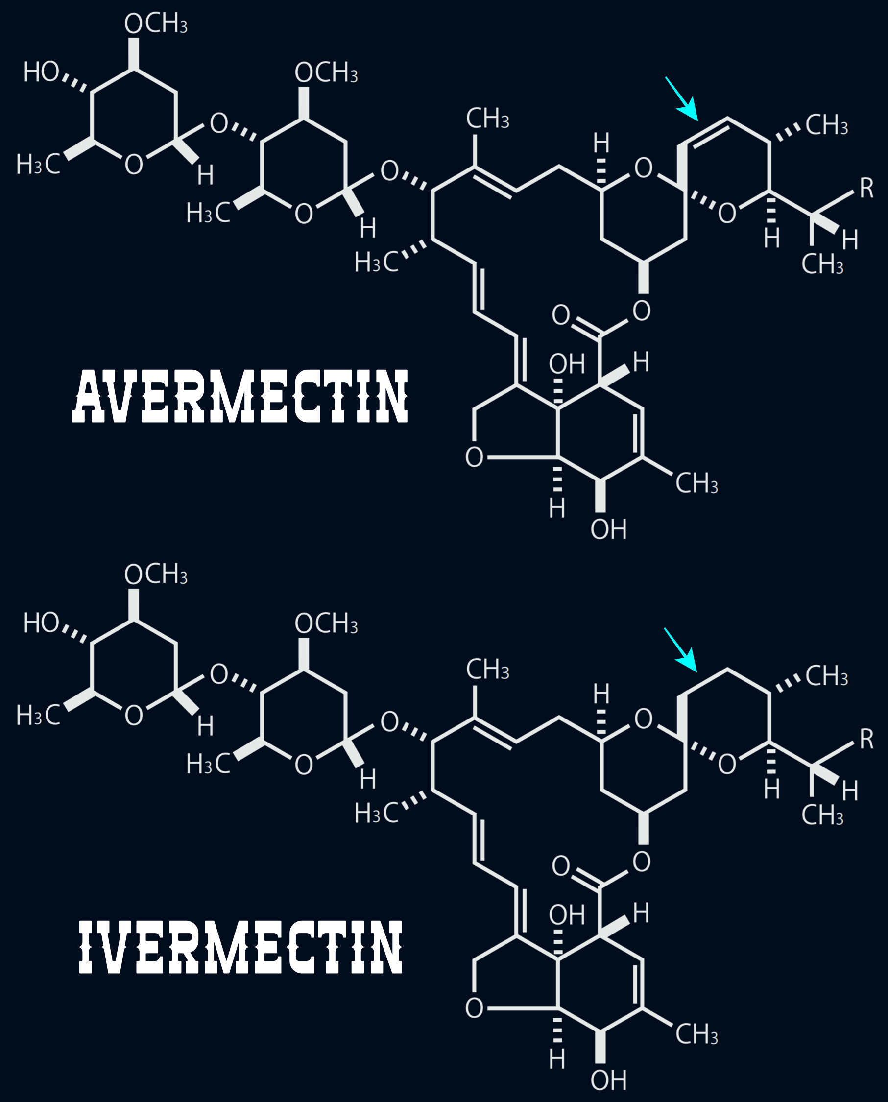 '에버멕틴'은 동물의 기생충병에는 효과적이었지만, 인체에는 부작용이 있었다. 그래서 '윌리엄 C. 캠벨' 박사는 '애버멕틴'의 분자 구조 일부를 바꾸어 부작용이 거의 없는 '아이버멕틴(ivermectin)'을 개발했다. '아이버멕틴'이라는 명칭은 '디히드로애버멕틴(Dihydroavermectin)'의 i와 vermectin에서 유래한다. '디히드로(Dihydro-)'라는 라는 것은 수소 원자를 2개와 결합한다는 의미이므로, '아이버멕틴(ivermectin)'은 '에버멕틴(avermectin)'에 수소 원자 2개를 결합한 물질이라는 뜻이다. 빨간색 화살표의 끝부분이 '애버멕틴'에서 '아이버멕틴'으로 변경된 부분이다.