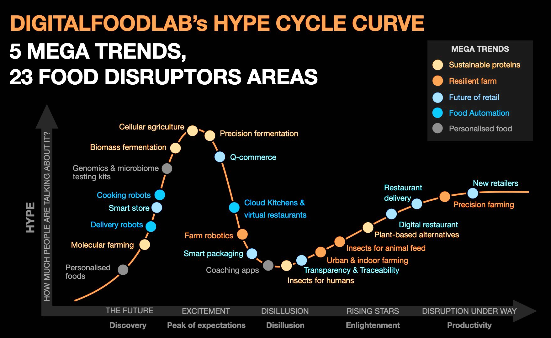 2021년에 푸드테크 조사 전문기관 '디지털푸드랩(Digital Food Lab)'은 푸드테크와 관련한 23개의 혁신 영역에서 '지속 가능한 단백질(Sustainable Proteins)', '회복력 있는 농장(Resilient farm)', '소매업의 미래(Future of retail)', '푸드 자동화(Food Automation)', '개인 맞춤형 식품(Personalised food)' 분야를 5대 메가 트렌드로 언급하였다.